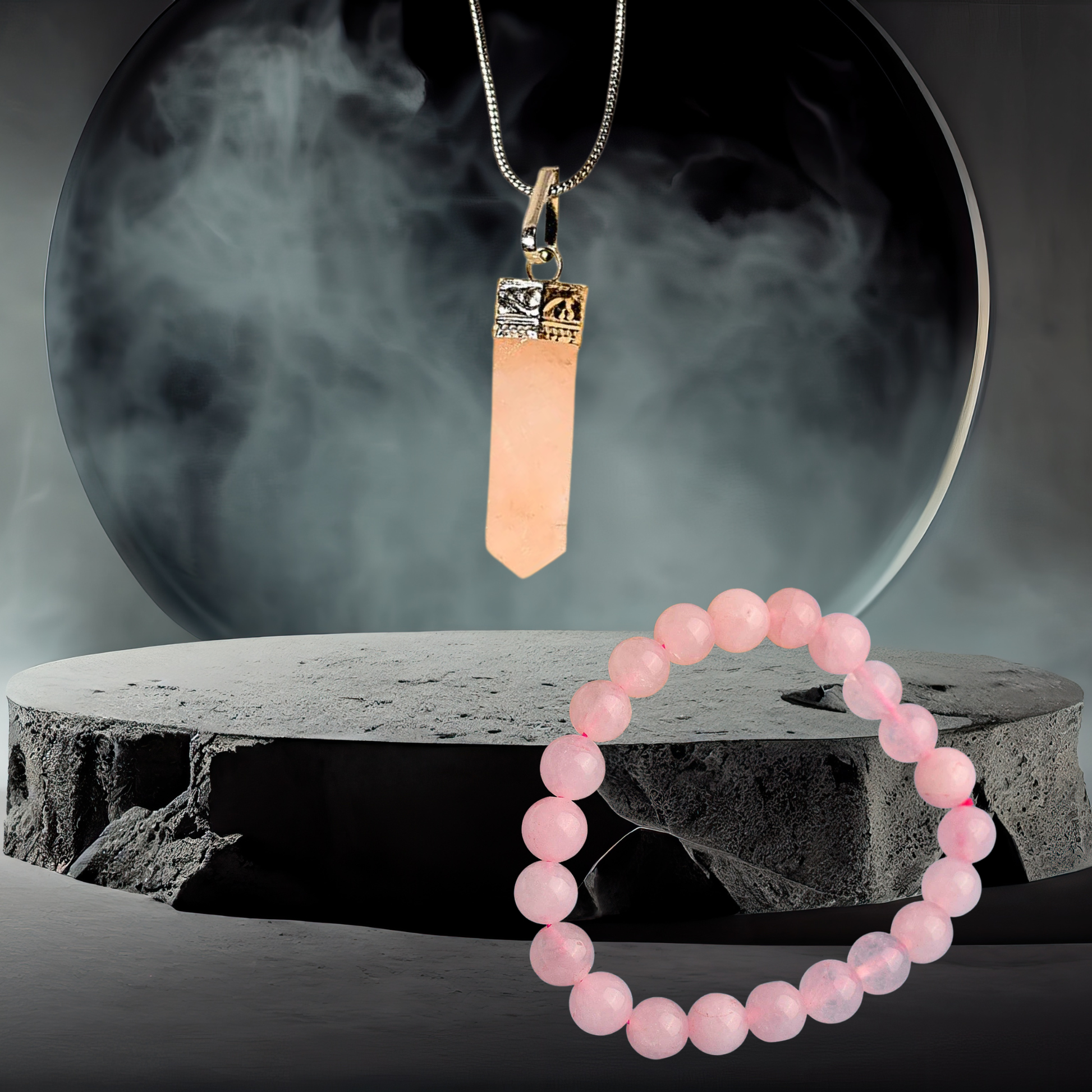 The Rose Quartz Pendant opens the heart to compassion and understanding, while the Rose Quartz Bracelet helps release stress and attract harmonious relationships.