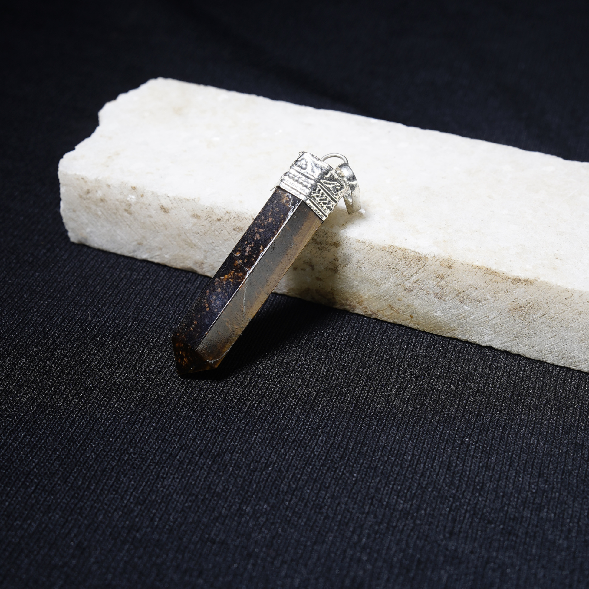 The Tiger Eye Pencil Pendant is known for its grounding and protective properties. Crafted from genuine tiger eye stone, it is said to enhance courage and confidence.